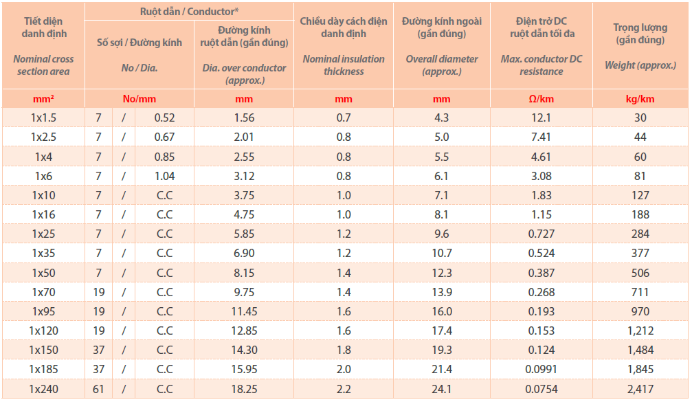 - Ruột dẫn: Đồng ủ mềm (cấp 2, bện tròn hoặc nén chặt)