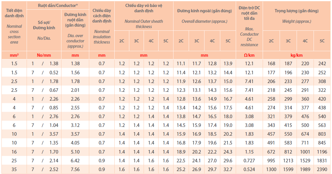- Ruột dẫn: Đồng ủ mềm (cấp 1 hoặc 2)