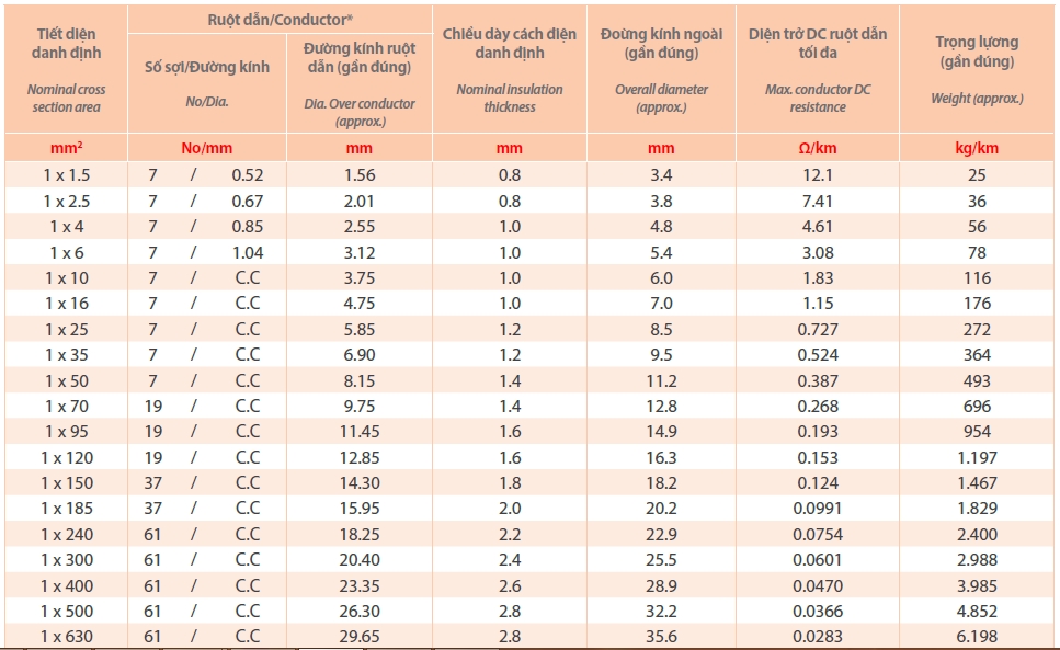 - Lõi cáp: màu cam hoặc vàng – xanh hoặc theo yêu cầu
