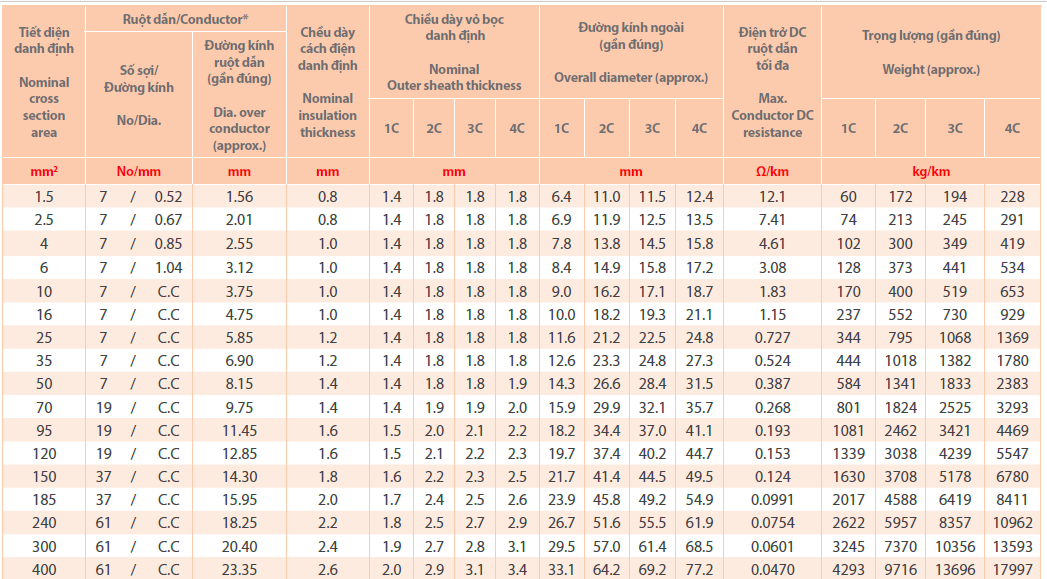Cách điện: FR-PVC - Chất độn, băng quấn và vỏ bọc trong (nếu cần): PP, PET, FR-PVC