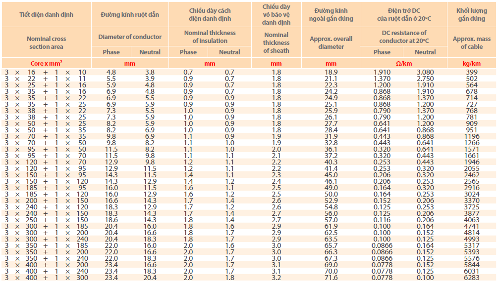 - Điện áp định mức (Uo/U): 0.6/1kV