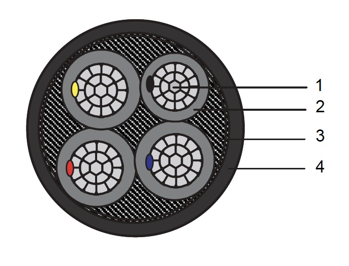 Cáp điện lực, 4 lõi, trung tính giảm, ruột nhôm nén chặt, cách điện XLPE, không giáp, có vỏ bọc, 0.6/1kV