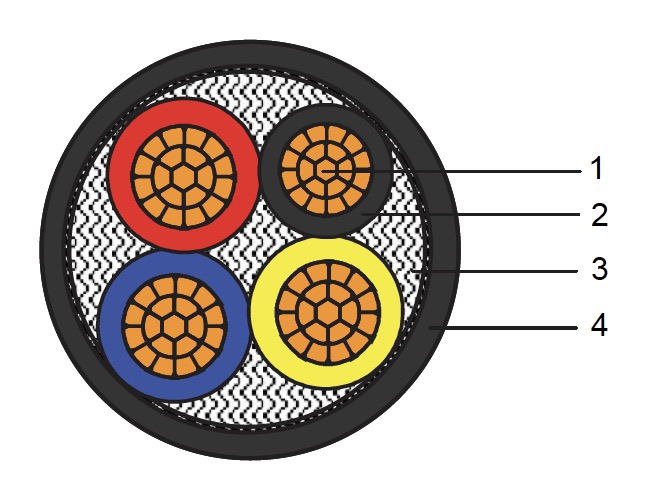 Cáp điện lực, 4 lõi, trung tính giảm, ruột đồng nén chặt, cách điện PVC, không giáp, có vỏ bọc