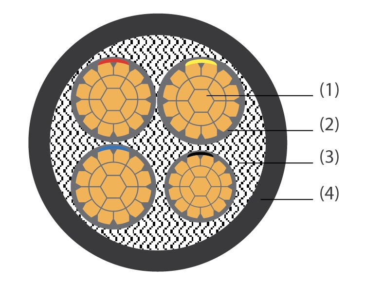 Cáp điện lực, 4 lõi, trung tính giảm, ruột đồng nén chặt, cách điện XLPE, không giáp, có vỏ bọc