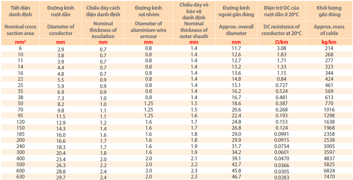 Cấu trúc: Cu/XLPE/PVC/AWA/PVC