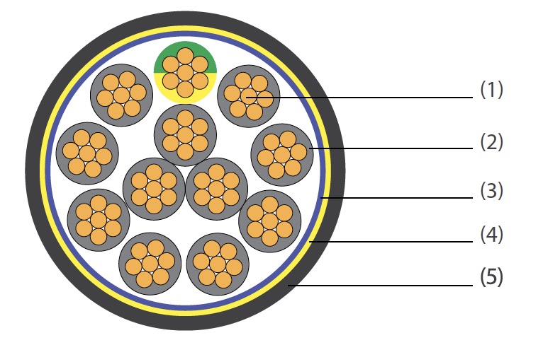 - Cáp 5 lõi trở lên: Bằng số in trên nền cách điện màu đen ngoại trừ 1 lõi màu xanh lục-vàng (nếu có)