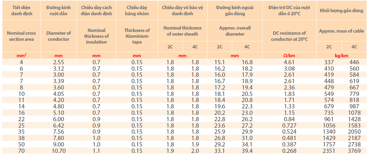 Cấu trúc: Cu/XLPE/PVC/ATA/PVC