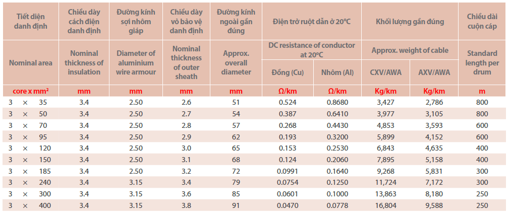 Cấu trúc: Cu(Al)/XLPE/PVC/AWA/PVC