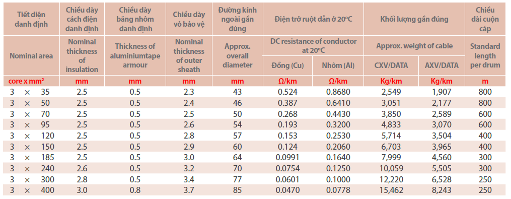 Cáp điện lực, 3 lõi, ruột đồng hoặc nhôm, có giáp (2 dải băng nhôm), có vỏ bọc