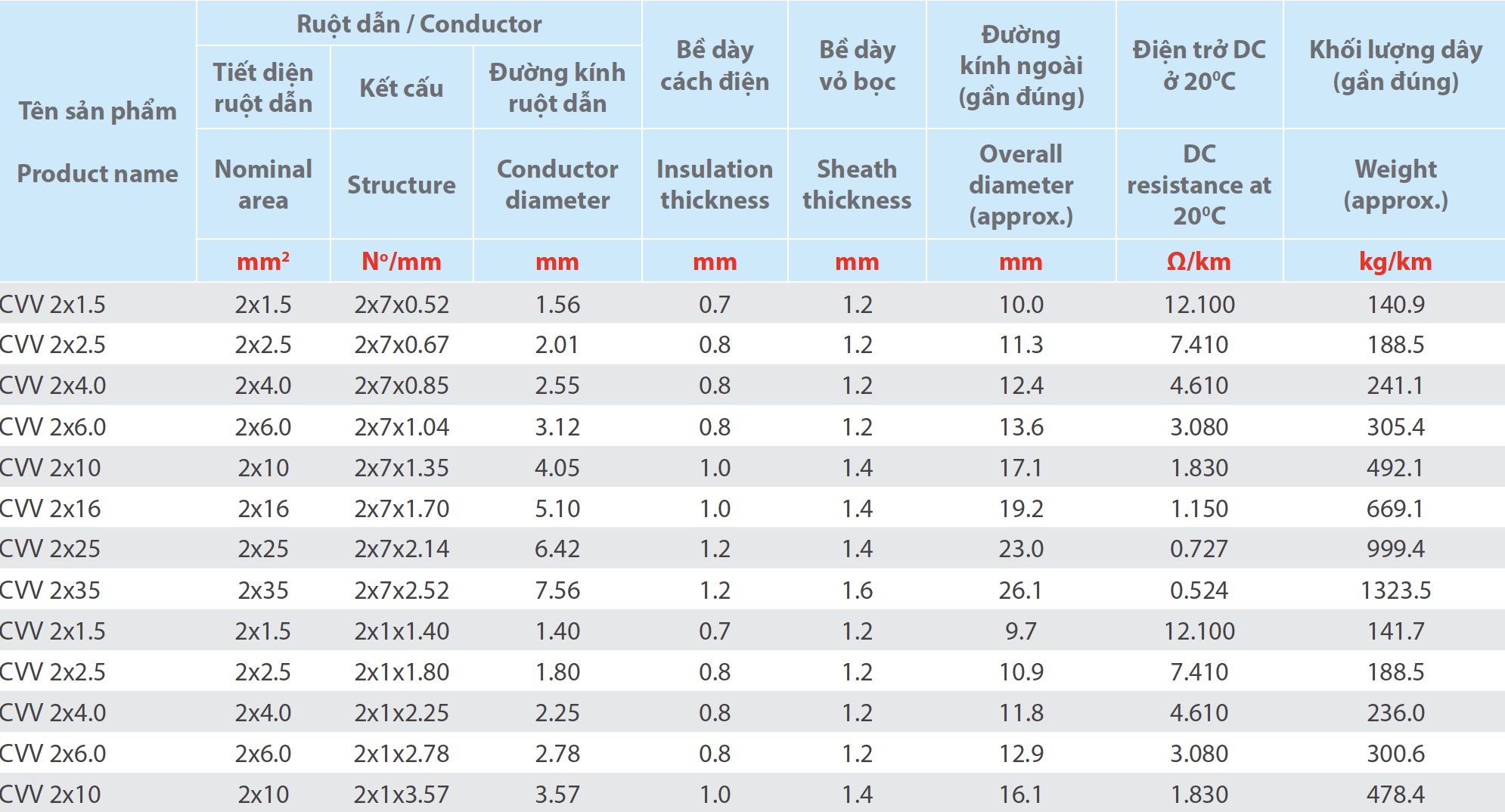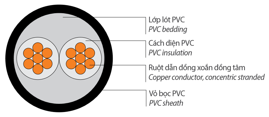 Cáp điện lực, 2 lõi, ruột đồng, cách điện PVC, vỏ bọc PVC.