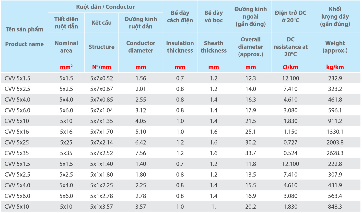 Cáp điện lực, 5 lõi, ruột đồng, cách điện PVC, vỏ bọc PVC