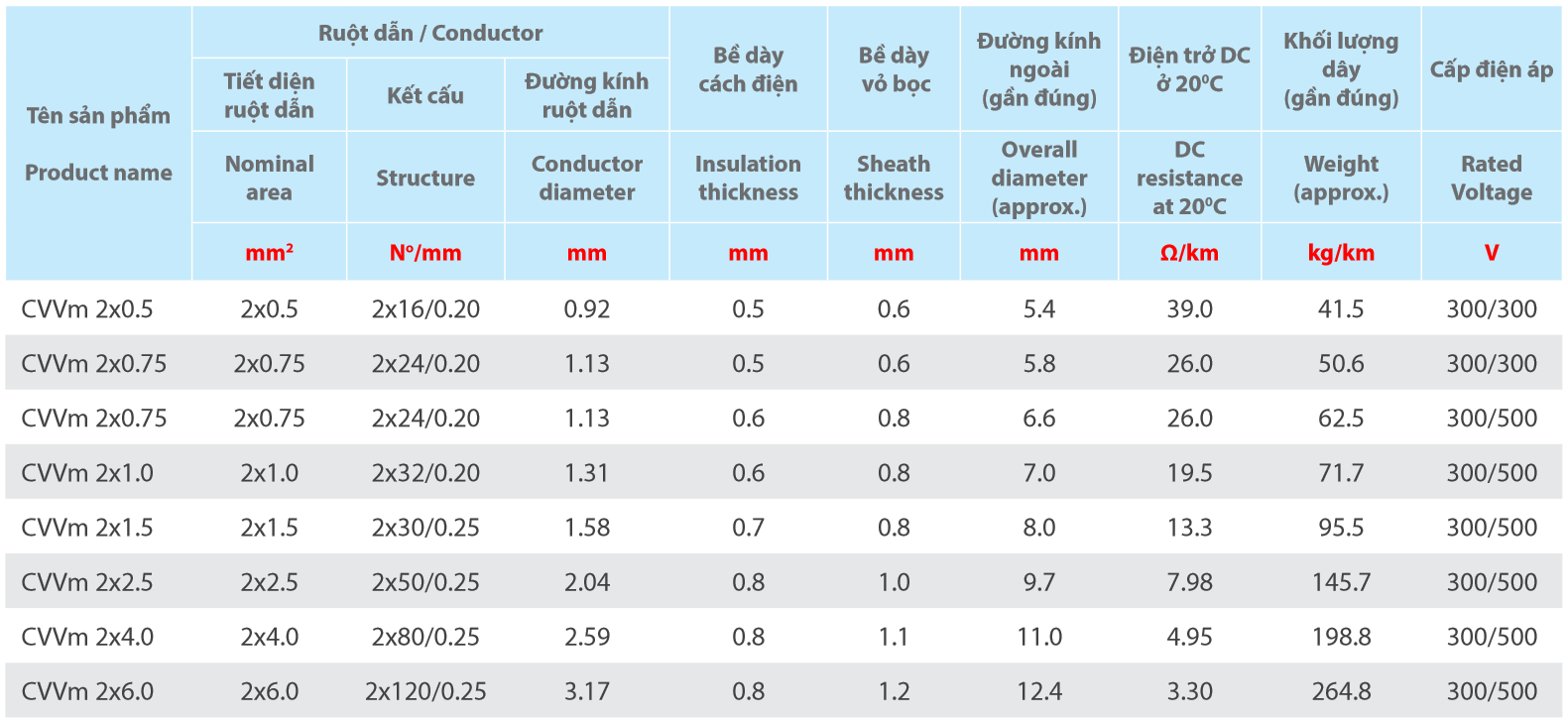 Cấp điện áp (Uo/U): 300/300V và 300/500V