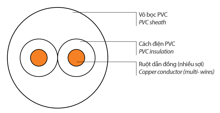 Cáp mềm tròn, 2 lõi, ruột đồng, cách điện PVC, vỏ bọc PVC